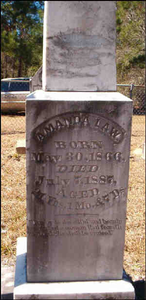 • Tombstone. Photo taken by Ray Faircloth - Feb 2009 Amanda married Millard Fillmore Law. (Millard Fillmore Law was born on 16 Jul 1855 in Coffee, AL, died on 22 Sep 1885 and was buried in James Lee Cemetery, Magnolia Springs, Jasper, TX.) |