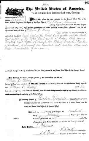 Land, 17 Jan 1902, Williana, Grant Parish, LA. Name: William E[dgar] Murry Land Office: NEW ORLEANS Sequence #: 1 Document Number: 10043 Total Acres: 119.13 Misc. Doc. Nr.: 17944 Signature: Yes Canceled Document: No Issue Date: 17 Jan 1902 Mineral Rights Reserved: No Metes and Bounds: No Statutory Reference: 12 Stat. 392 Multiple Warantee Names: No Act or Treaty: May 20, 1862 Multiple Patentee Names: No Entry Classification: Homestead Entry Original Land Description: 1 N½NE LOUISIANA No 8 N 2 W 34 2 SWNE LOUISIANA No 8 N 2 W 34