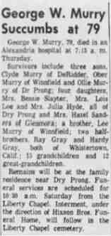 Survivors include three sons, Clyde Murry of DeRidder, Ober Murry of Winnfield, Ollie Murry of Dry Prong, four daughters, Mrs. Bessie Slaytor, Mrs. Lois Loe and Mrs. Julia Hyde, all of Dry Prong and Mrs. Hazel Sanders of Glenmora; a brother, Lee Murry of Winnfield; two half-brothers, Ray Gray and Hardy Gray, both of Whistertown, Calif.; 15 grandchildren and 12 great-grandchildren.