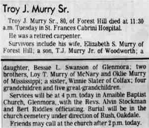 Survivors include his wife, Elizabeth S. Murry of Forest Hill; a son T.J. Murry Jr. of Woodworth; a daughter, Bessie L. Swanson of Glenmora; two brothers, Loy T. Murry of McNary and Oklie Murry of Mississippi; a sister, Winnie Slater of Colfax; four grandchildren and five great-grandchildren.