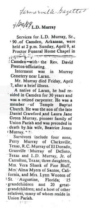A native of Laran, he had resided in Camden for 30 years and was a retired carpenter. He was a member of Temple Baptist Church. He was the son of the late Daniel Crawford and Laura Jane Green Murray, pioneer family of Union Parish and was preceded in death by his wife, Beatrice Jones Murray. Suvivors include four sons, Perry Murray of Clarksville, Texas, R.C. Murray of El Dorado, Grandville Murray of Desoto, Texas and L.D. Murray, Jr. of Carrolton, Texas, three daughters, Mrs. Vera Shank of Pine Bluff, Mrs. Alma Myers of Santee, California, and Mrs. Lynn Wooten of St. Augustine, Florida; 15 grandchildren and 20 great- grandchildren; and a host of other relatives, many of whom reside in Union Parish.