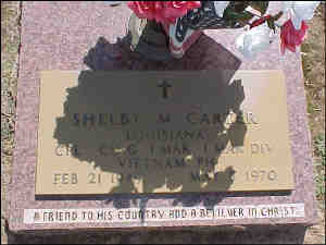 • Military. http://www.virtualwall.org/dc/CarterSM01a.htm Shelby M Carter Corporal PERSONAL DATA Home of Record: Dry Prong, Louisiana Date of birth: Monday, 02/21/1949 MILITARY DATA Service: Marine Corps (Regular) Grade at loss: E4 Rank: Corporal ID No: 439807978 MOS: 0311 Rifleman LenSvc: Between 1 and 2 years Unit: G CO, 2ND BN, 1ST MARINES, 1ST MARDIV CASUALTY DATA Start Tour: Monday, 06/30/1969 Cas Date: Friday, 05/08/1970 Age at Loss: 21 Remains: Body Recovered Location: Quang Nam, South Vietnam Type: Hostile, Died Reason: Multiple Fragmentation Wounds - Ground Casualty ON THE WALL Panel 11W Line 130