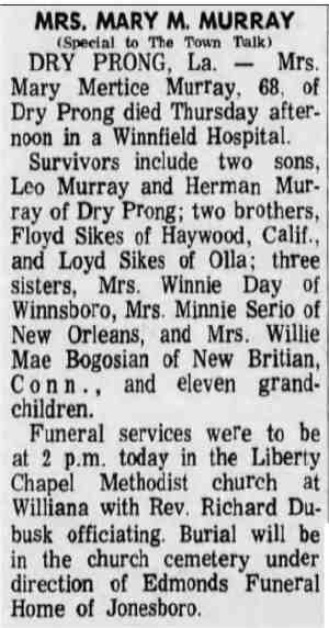 Survivors include two sons, Leo Murray and Herman Murray of Dry Prong; two brothers, Floyd Sikes of Haywood, Calif.; and Lloyd Sikes of Olla; three sisters, Mrs. Winnie Day of Winnsboro, Mrs. Minnie Serio of New Orleans, and Mrs. Willie Mae Bogosian of New Britian, Conn., and eleven grandchildren.