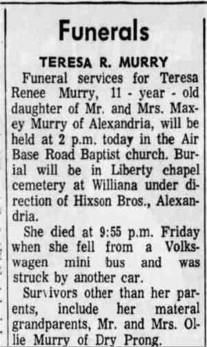 Funeral services for Teresa Renee Murry, 11-year-old daughter of Mr. and Mrs. Maxey Murry of Alexandria, will be held at 2 p.m. today in the Air Base Road Baptist church. Burial will be in Liberty Chapel cemetery at Williana under direction of Hixson Bros., Alexandria.